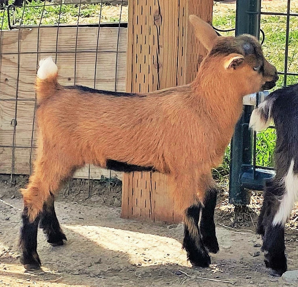 “The Towne Crier” Polled dark chocolate buckskin. Kidded 7 May 2023 to Tabitha *D and Austin Pedigree