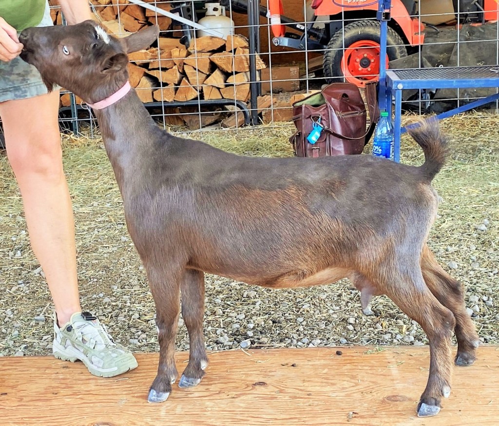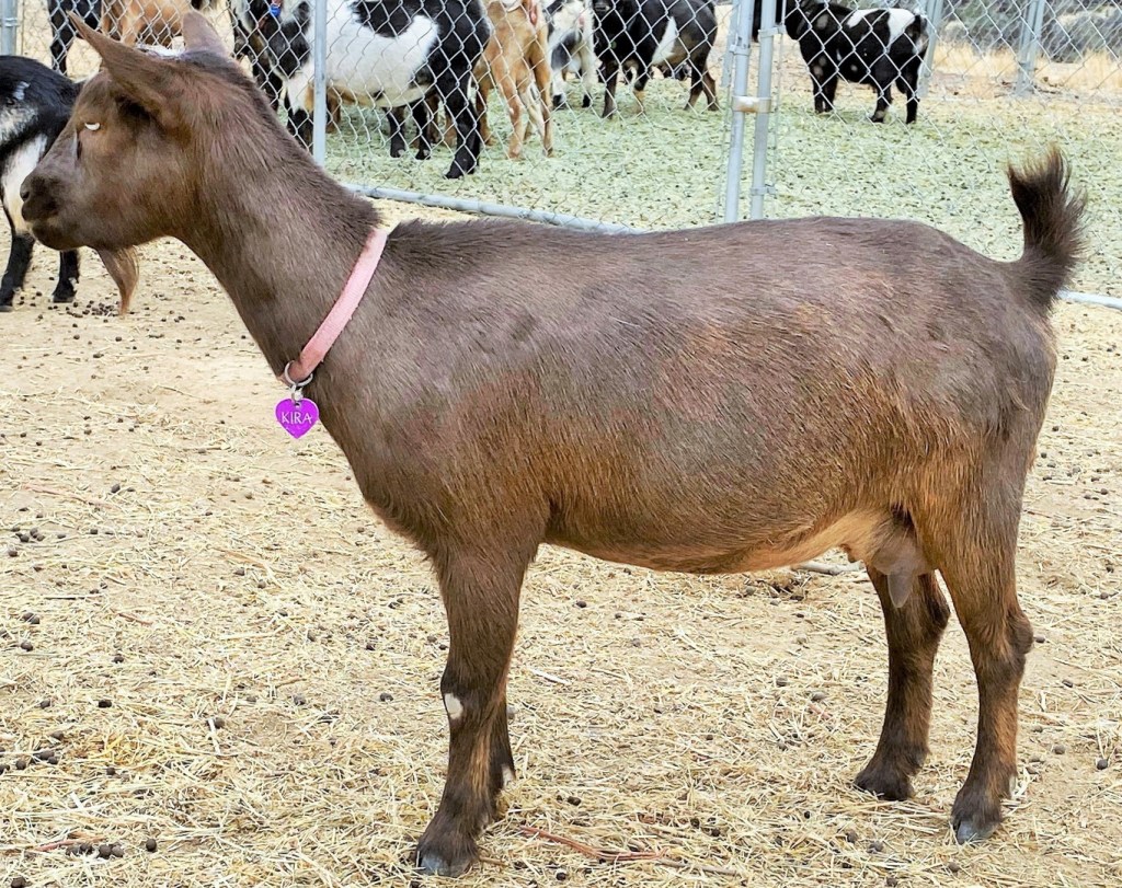 Kira is such a sweetie and a delight to have around. Her icy blue eyes with the beautiful chocolate coat is so eye-catching! She loves to be on the milking stand and has nice big orifices so she milks out quickly. Her milk tested at 6.7% butterfat and 4.2% protein in 2022.