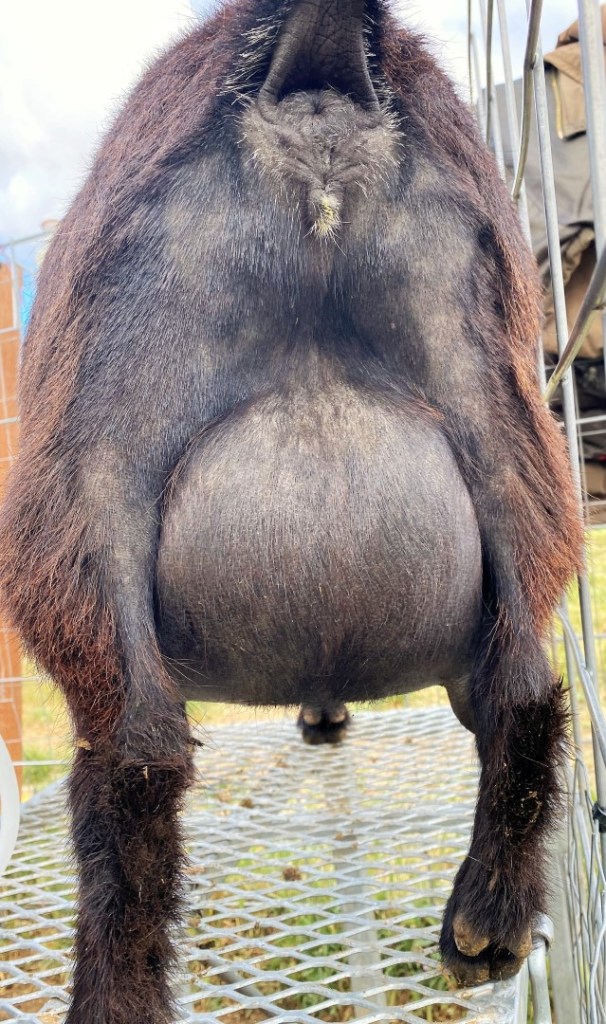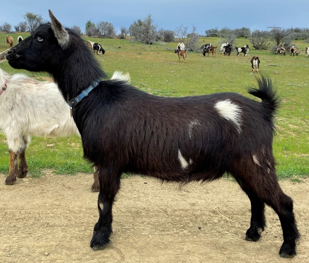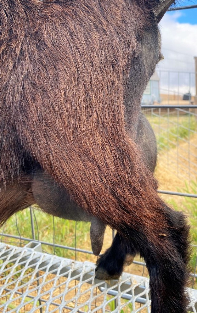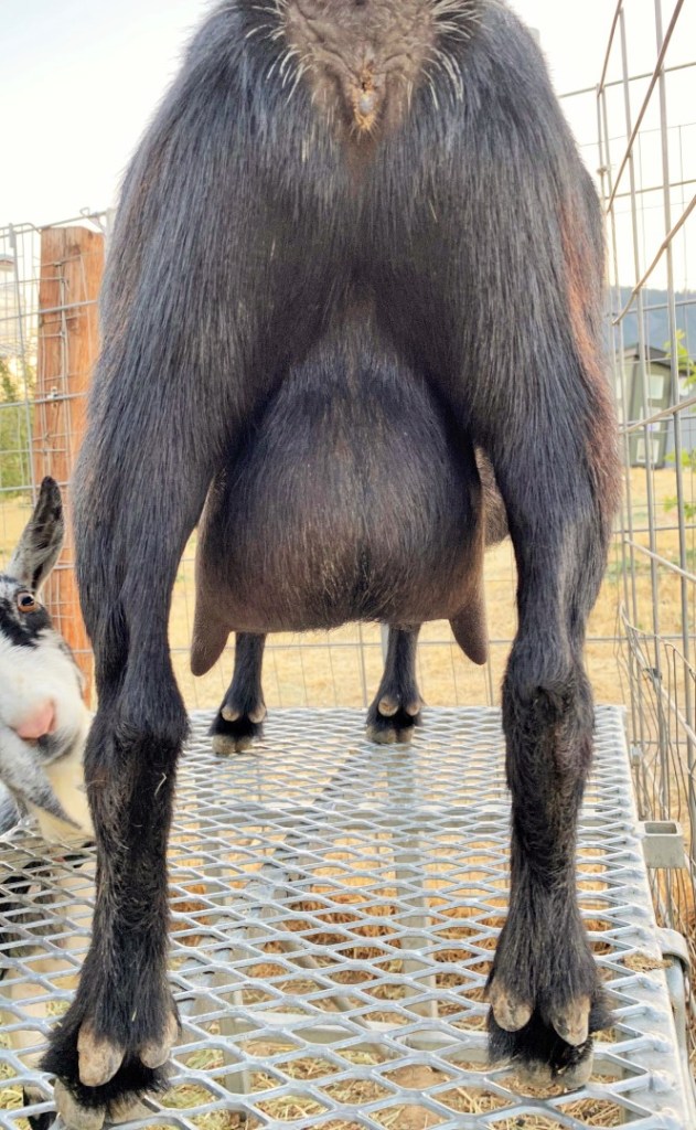 Such a cute moonspot eyebrow, plus striking blue eyes. Stella did a great job kidding in 2023! Even though one of the boys was pretty big, she pushed him right out without any trouble. The other boy was covered with moonspots, so she’s definitely producing them… and blue eyes. 🙂 She had a doeling and 2 bucklings, all buckskin with blue eyes, in 2025 (pictured below). She’s a great mom, and is milk stand trained. She’s got big teats that fit nicely in hands or machine, and excellent large orifices. Could probably go any time, in milk. She’s currently still nursing her darling daughter. I believe Stella could easily earn her milk stars… I intended to have her on test this year, but she was the last to kid and I was already testing 12, so decided to leave her with the kids.